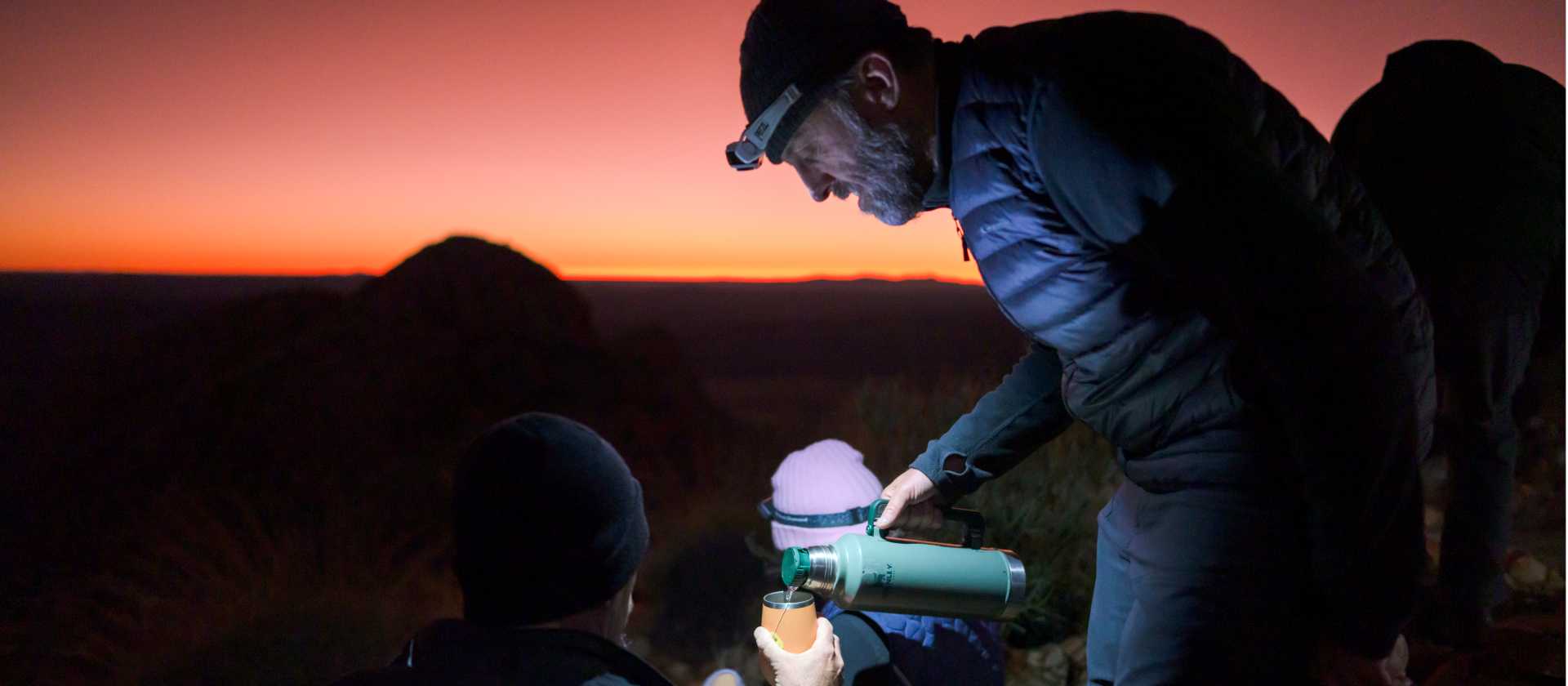 Your guides will have you up early this morning (2-3am) for our pre-dawn walk up Mount Sonder. We'll drive to Redbank Gorge to begin the walk. Weaving your way up to the 1380m summit of this majestic mountain following only the glittering light of your head-torch, surrounded by deep and peaceful darkness, is a truly inspiring experience... and watching the sunrise from the top is unforgettable! Mount Sonder is the official end and highest point of the entire Larapinta Trail and as such we have expansive views across the entire vast landscape we have been exploring over the last few days. We descend to Redbank Gorge and can enjoy a great brunch back at camp. There are options for this afternoon, including resting at camp or swimming at Glen Helen. Walking distance: 16km Driving time: 25 minutes